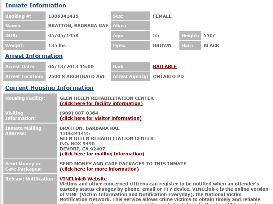 So Barbara Bratton is currently in solitary confinement in the Glen Helen detention center in Devore, CA.