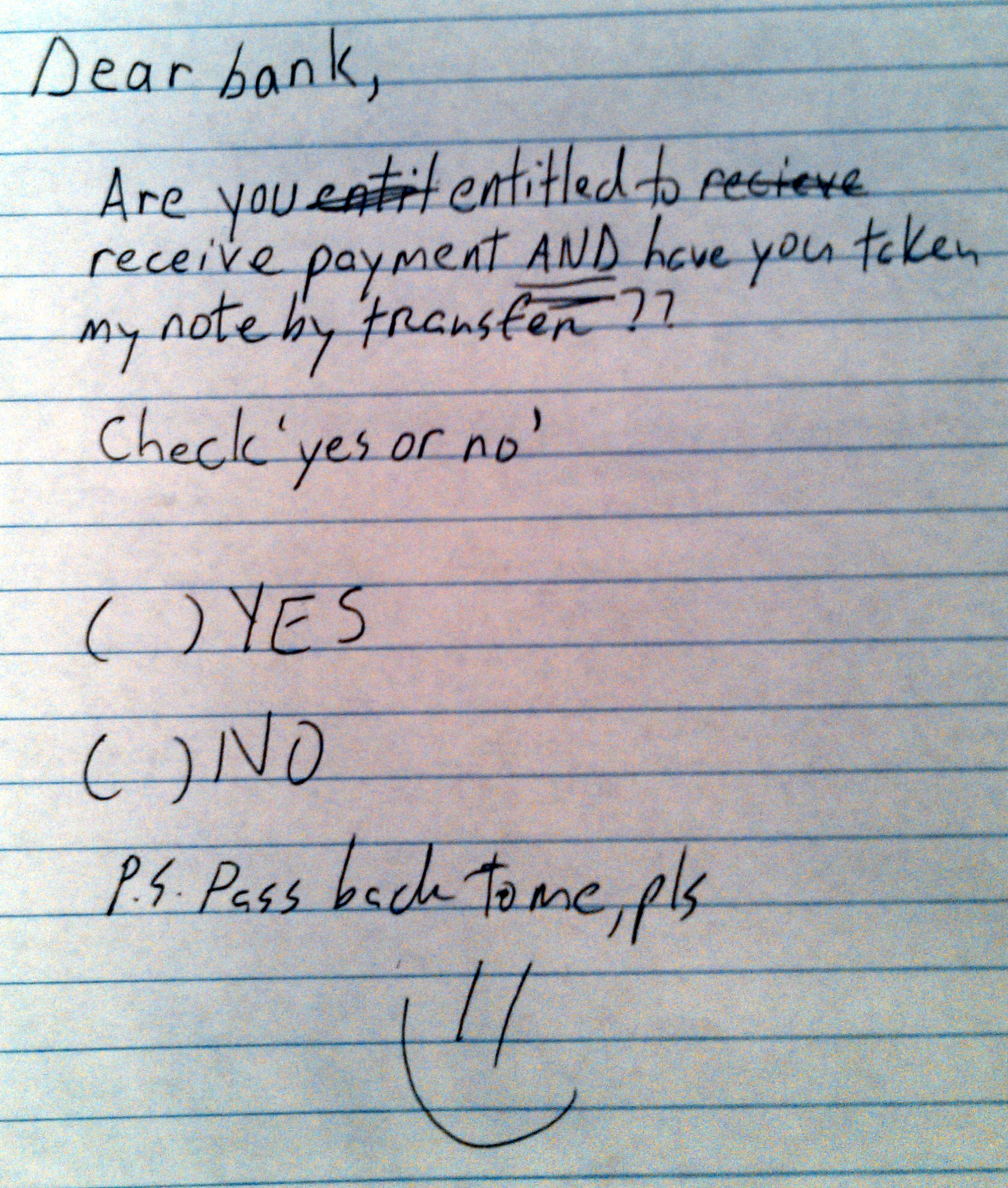 NOTE-check yes or noTwo days ago I wrote the post “Is There Even A Note Holder To Pay?”   Shelley Erickson then posted on Facebook a very similar article from two years ago written by the Minnesota judiciary’s favorite whipping boy, Bill ButlerThe entertaining and extremely informative article says this: