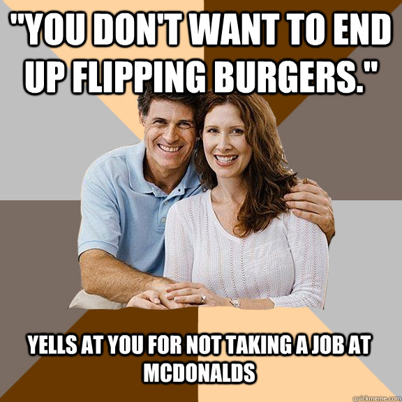 I say “I think” because there’s a lot of disparaging comments about low-wage workers whenever I post one of these memes, as if just because someone finds himself working in fast food, he unquestionably is an unskilled, uneducated, teenage chump who just needs to get some ambition and/or go back to school.