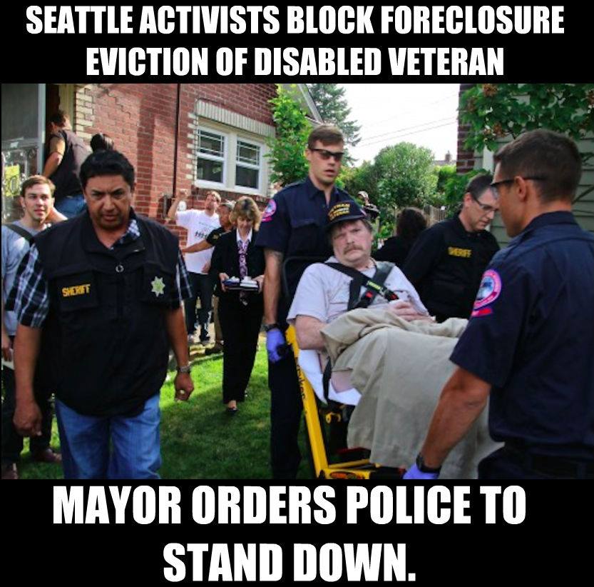 As I reported on Friday, SAFE—joined by members of Socialist Alternative, including state house candidate Jess Spear—surrounded the Bartons’ West Seattle bungalow when King County Sheriff deputies arrived that morning to enforce an eviction order, following the foreclosure and sale of their house. The deputies attempted to evict the couple by loading Byron, who uses a wheelchair to get around, into an ambulance.