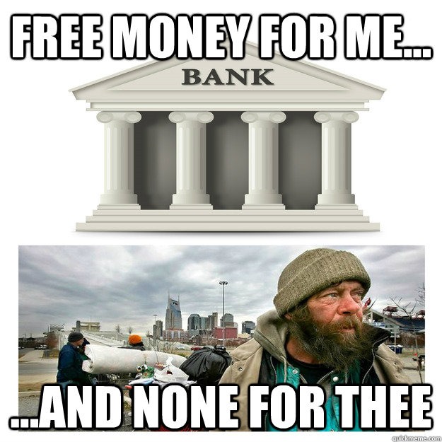 So since banks can “lend” money at zero risk—as we have shown that banks do as a matter of course—there is no capitalism. There’s especially not capitalism when the same banks can use the state to extract the artificial, fictional, risk-free money from people who can ill afford it, or even from those who can afford it. The lie that banks lend money and take risks in doing so is now so thoroughly discredited that the current system which enforces that lie needs to be junked immediately in favor of one that accepts that all money is fictional and is only a means to an end, not an end unto itself.