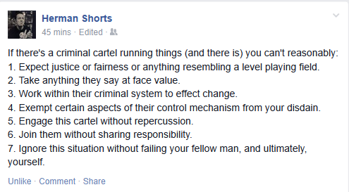 And that brings us to a Master Narrative-busting list from my Facebook friend Herman Shorts. When I read it, I knew I had to share it. As Smith concluded, what we now have is “authority without accountability or recourse and abuse of power without limits.” In other words, criminality—lawlessness. As I wrote last year, debunking one part of the Master Narrative, “America Is A Nation of Men, Not of Laws.” That article quoted Paul Craig Roberts on this subject of lawlessness: