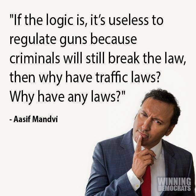 That’s actually a good question from Mr. Mandvi in the above meme: “Why have any law?” Of course, he’s talking about gun laws.