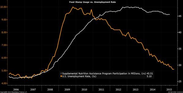 She then shows the chart above titled “Food Stamp Usage vs. Unemployment Rate” (unemployment is the orange line, food stamps the white line). Indeed, in both charts, it is obvious that until about 2007 or so, credit and GDP moved together as did food stamp use with unemployment.