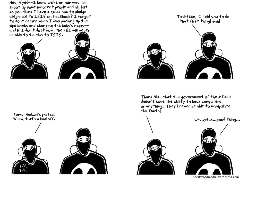 One of the more ridiculous aspects of the story, the “inexplicably intact passport” trope, we might call it, was that Tashfeen Malik “pledged allegiance to ISIS” on Facebook just before the attack. We imagine that (extremely unlikely) scenario here: