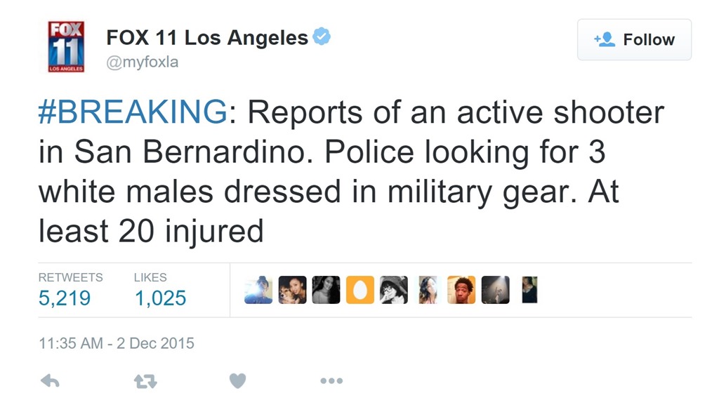 Indeed, the Fox affiliate in Los Angeles tweeted that police were seeking 3 white males in relation to the shooting, in this tweet helpfully screen-capped at patheos.com in a story by Lilandra Ra: