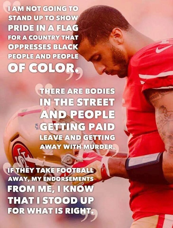 …and a Facebook friend mused that he could support Kaepernick in this case if only he hadn’t made it about race. I mused back that: